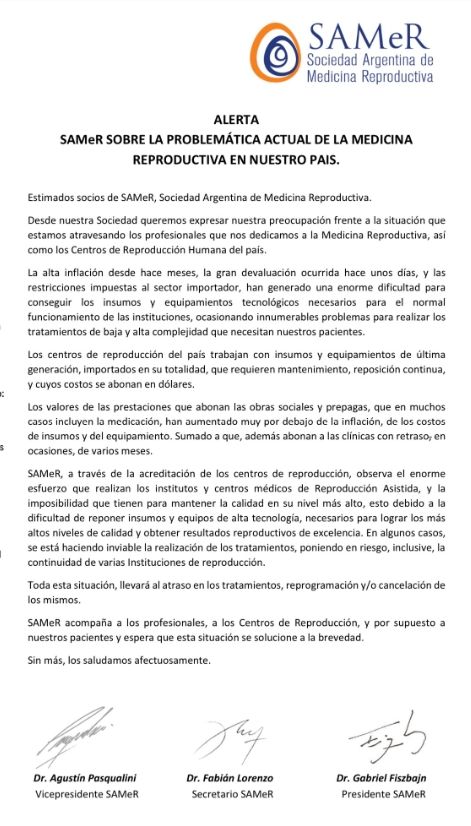 "SAMeR, a través de la acreditación de los centros de reproducción, observa el enorme esfuerzo que realizan los institutos y centros médicos de Reproducción Asistida, y la imposibilidad que tienen para mantener la calidad en su nivel más alto, esto debido a la dificultad de reponer insumos y equipos de alta tecnología, necesarios para lograr los más altos niveles de calidad", añade el comunicado, firmado por Gabriel Fiszbajn, titular de la entidad.