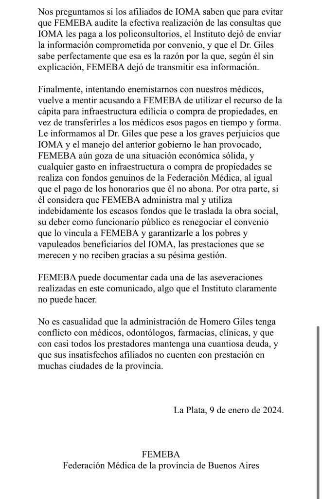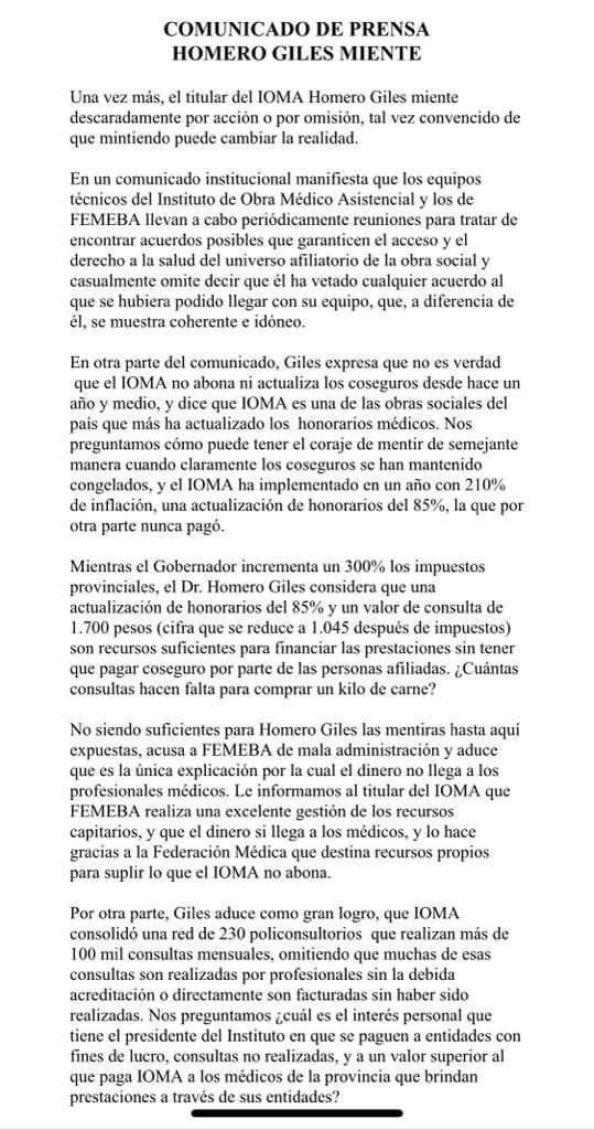 Lo que motivó una respuesta de FEMEBA a través de un comunicado en el que acusan al presidente de IOMA, Homero Giles, de mentir descaradamente y de ser el responsable de bloquear las negociaciones con los equipos técnicos “casualmente omite decir -Homero Giles- que él ha vetado cualquier acuerdo al que se hubiera podido llegar con su equipo, que, a diferencia de él, se muestra coherente e idóneo”.