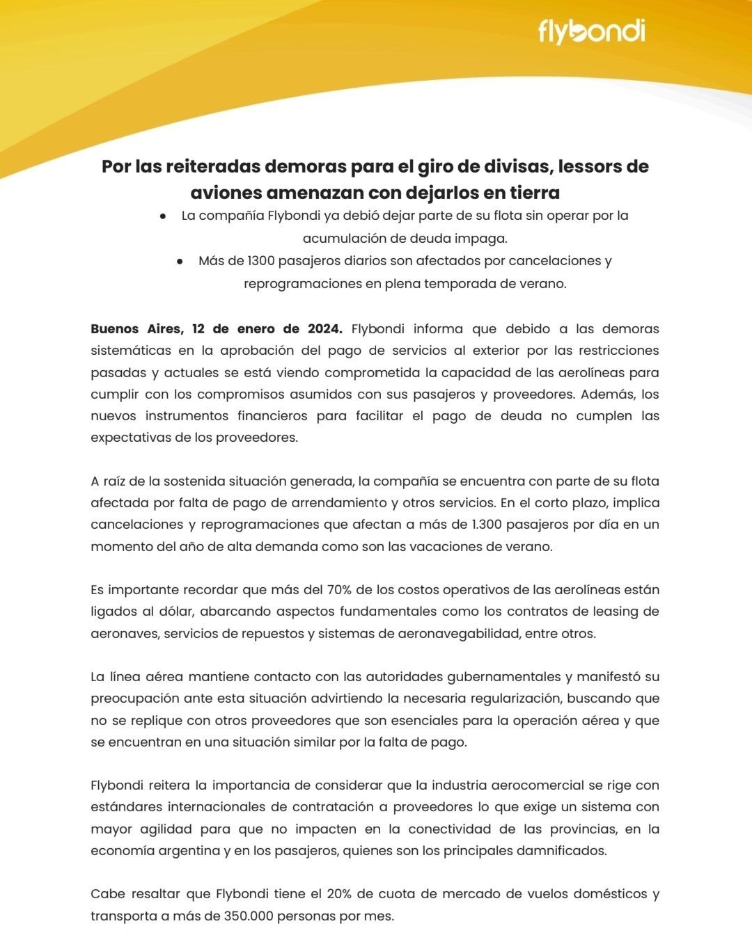 En el comunicado, indicaron también que “es importante recordar que más del 70% de los costos operativos de las aerolíneas están ligados al dólar, abarcando aspectos fundamentales como los contratos de leasing de aeronaves, servicios de repuestos y sistemas de aeronavegabilidad, entre otros”. Destacan también que la empresa lleva adelante el 20% de la cuota de vuelos domésticos del mercado y que transporta a más de 350.000 pasajeros por mes.