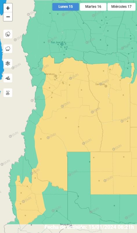 Por otro lado, una segunda alerta ha sido emitida por tormentas y la posible caída de granizo, que afectarán a la provincia durante la noche. Las áreas que enfrentarán estas condiciones incluyen no solo a las ya mencionadas afectadas por el Zonda, sino también a General Alvear, la zona baja de San Rafael, el este de Las Heras, La Paz, Lavalle, San Martín, Santa Rosa, y los departamentos de Capital, Godoy Cruz, Guaymallén y Maipú.