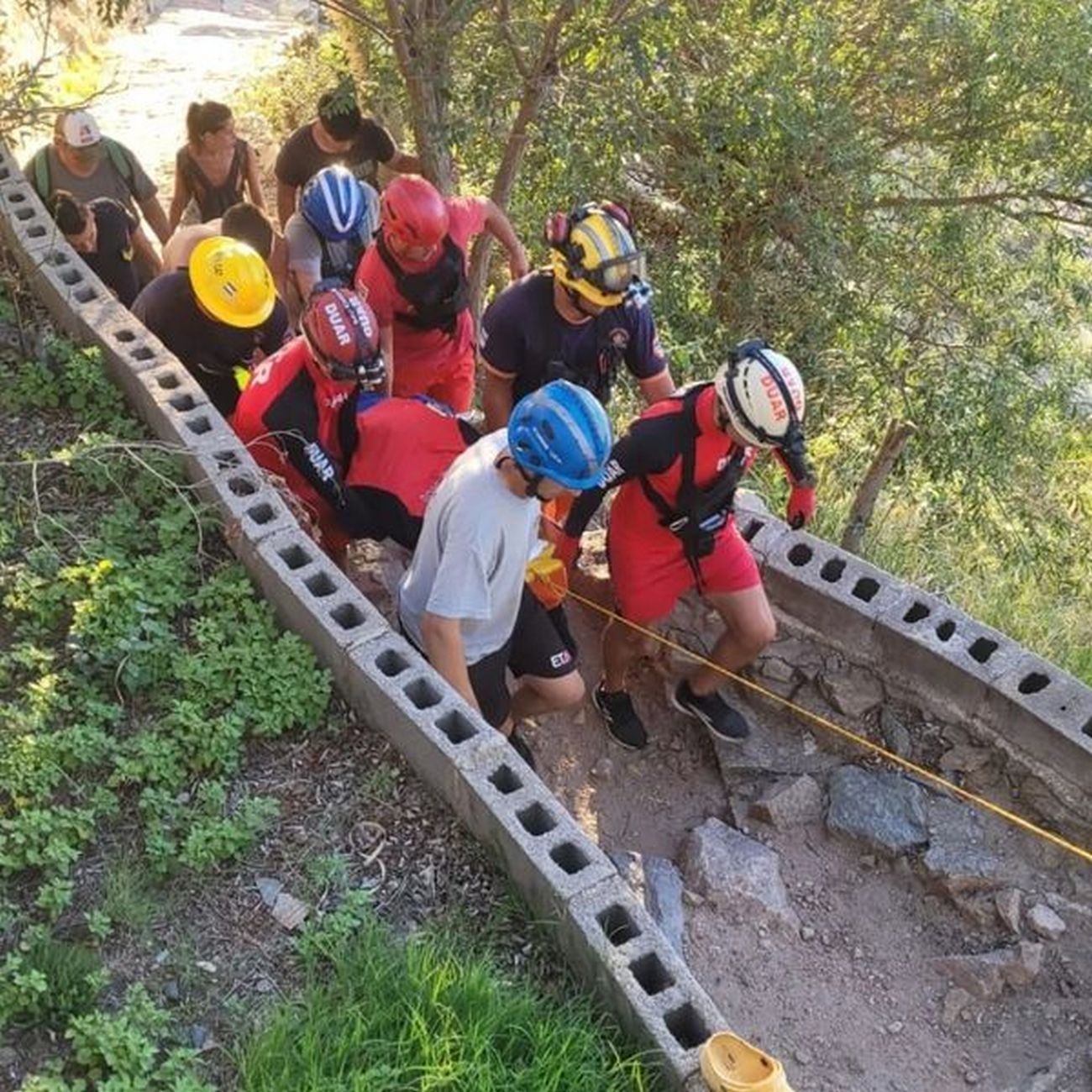 En un dramático rescate, en el que participaron además efectivos del Equipo Técnico de Acción ante Catástrofes (ETAC) y Bomberos Voluntarios de Mina Clavero, la damnificada pudo ser extraída luego quedar aprisionada entre las rocas, para ser inmovilizada y transportada en una camilla por senderos angostos de las Altas Cumbres, en un trayecto con una distancia de 1,5 kilómetros.