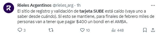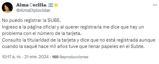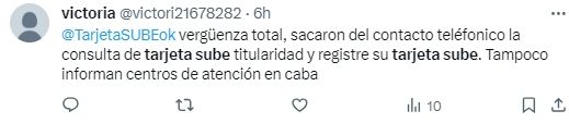 “Vergüenza total; sacaron del contacto telefónico, la consulta de tarjeta sube, titularidad y registre su tarjeta sube. Tampoco informan cuáles son los centros de atención en CABA”, expresó con enojo una usuaria de la red. Por su parte, otra mujer escribió: “No puedo registrar la SUBE. Ingreso a la página oficial y, al querer registrarla, me dice que hay un problema con el número de la tarjeta. Consulto la titularidad de la tarjeta y dice que no está registrada, aunque cuando la saqué hace mil años tuve que llenar papeles en el Subte”.