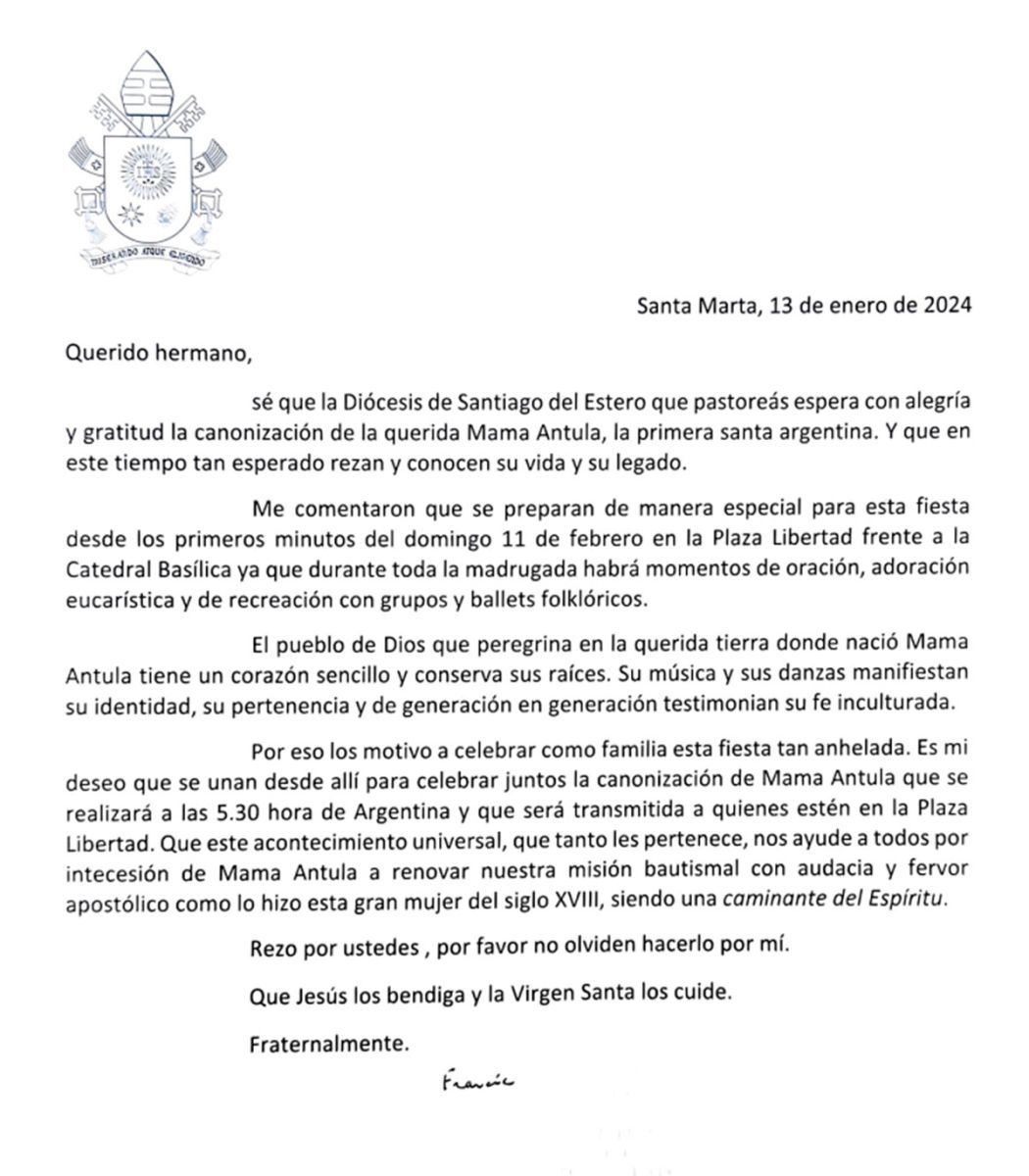 Qué dice la carta que el Papa le envió a los santiagueños por la canonización de Mama Antula