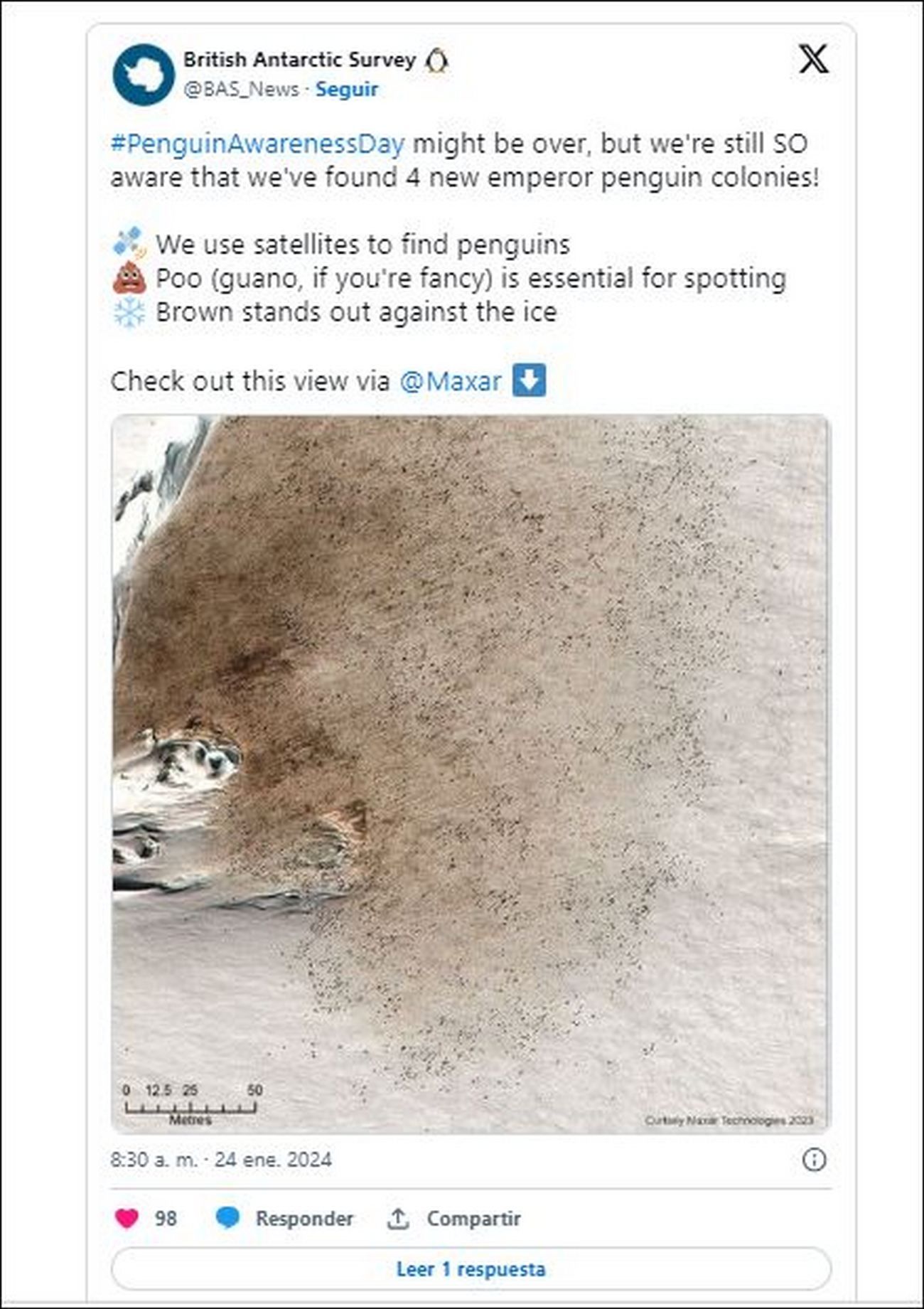 Gracias a imágenes satelitales, científicos del Centro Antártico Británico (BAS, por sus siglas en inglés) lograron hallar desde el espacio la existencia de cuatro colonias de pingüinos emperador previamente desconocidas.