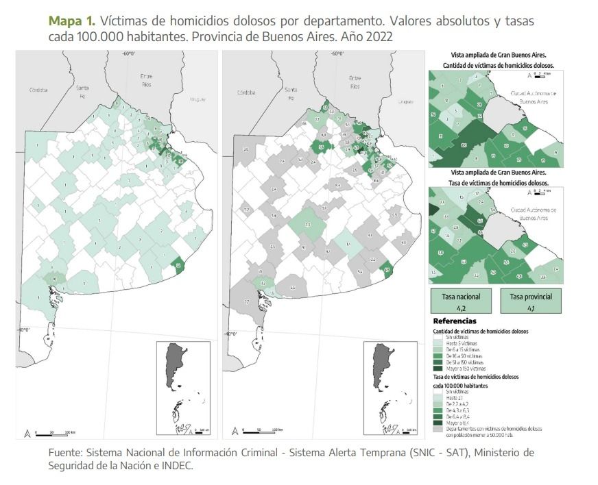 A nivel nacional, la tasa de homicidios del año 2022 fue de 4,2 cada 100 mil habitantes. Hubo 1.890 hechos de homicidios dolosos y 1.961 víctimas. Además, se registraron 1.253 homicidios dolosos en grado de tentativa y 1.382 víctimas.