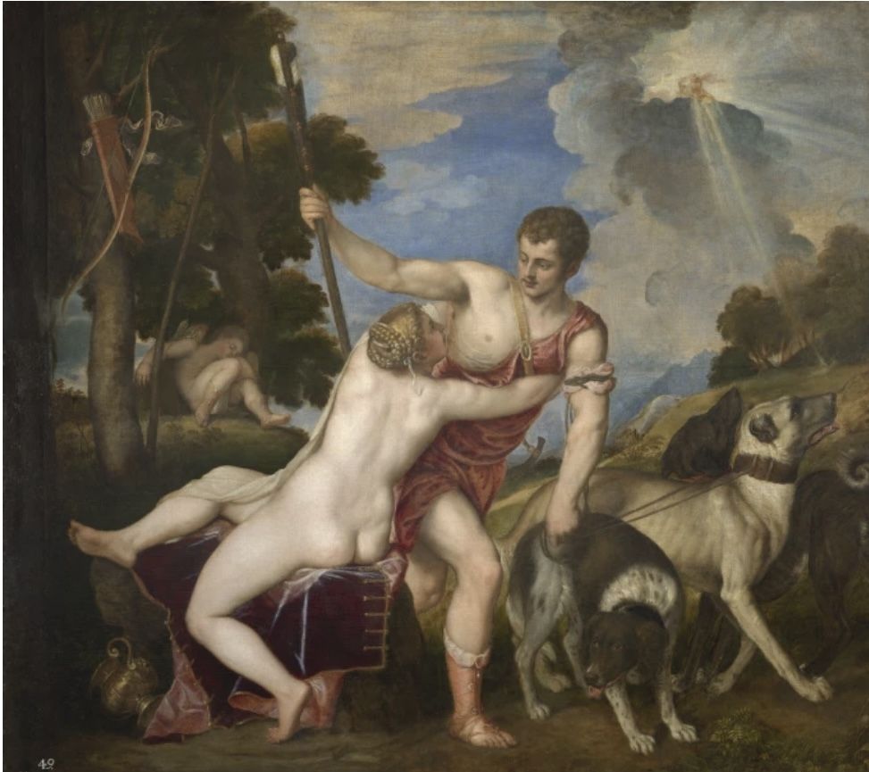 Describe a dos personajes de la mitología griega, Venus (la diosa de la belleza) y Adonis que parte para la guerra. La principal singularidad de la visión de Tiziano de un tema habitual en la pintura de la época, radica en la actitud y postura de Venus: en lugar de una beldad pasiva que simplemente se deja seducir, ella toma la iniciativa al intentar retener a Adonis. Además, la vemos de espaldas, con sus nalgas totalmente visibles. Esta parte de la anatomía femenina tenía por entonces una gran connotación erótica.