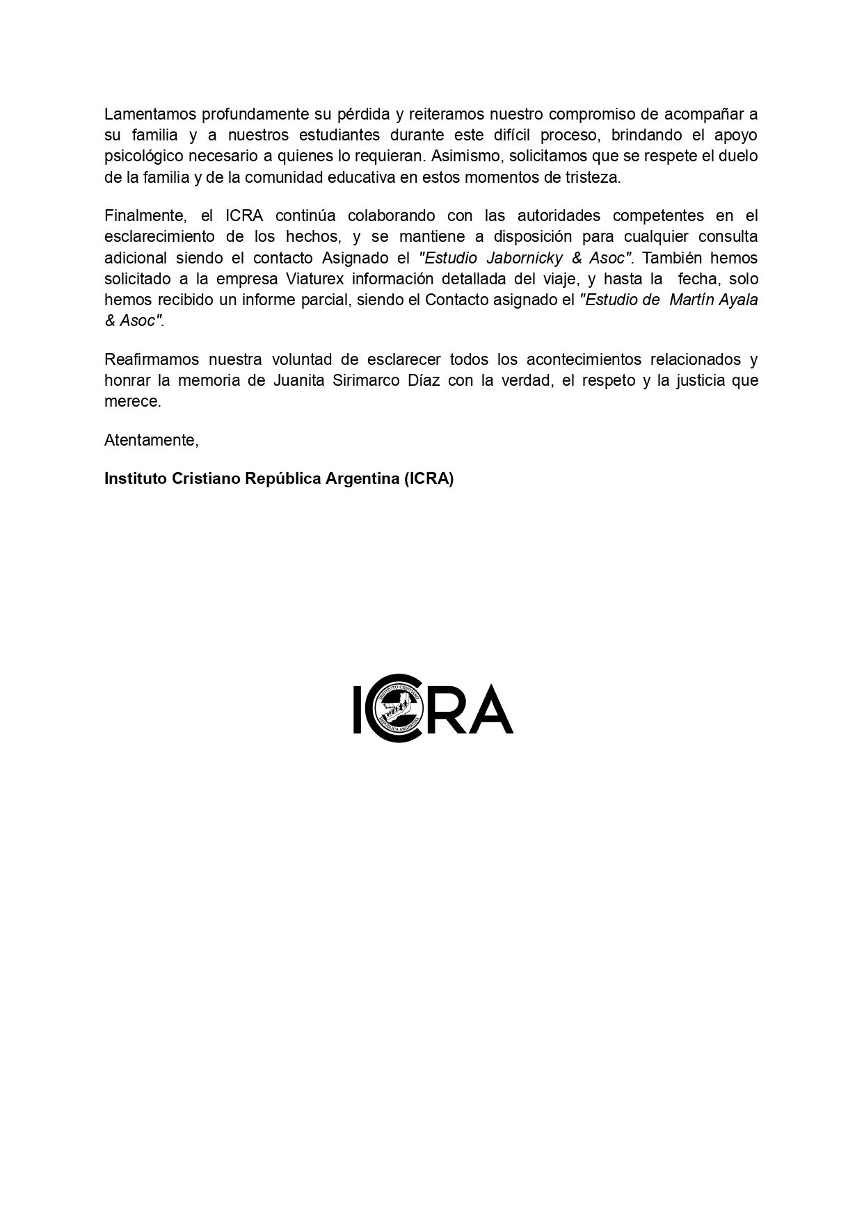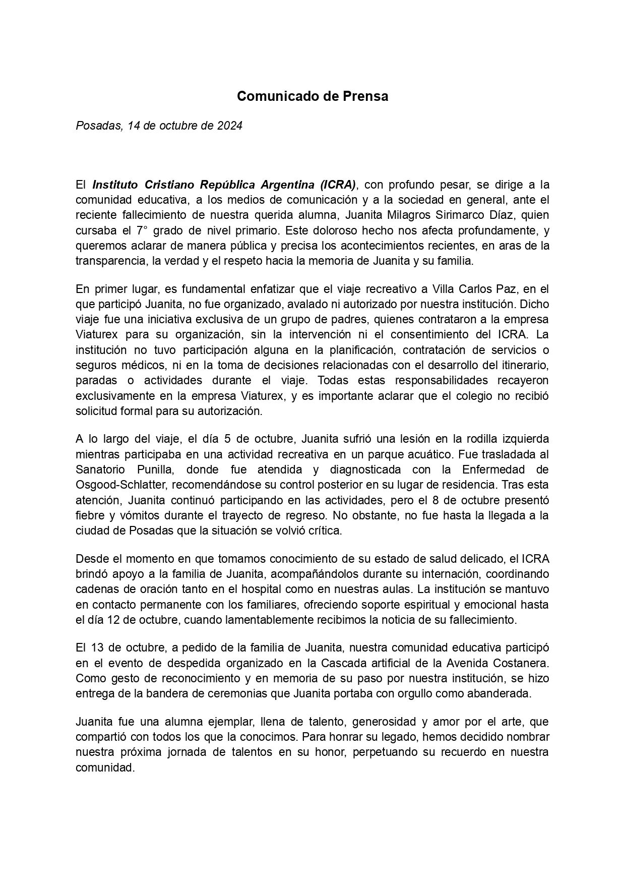 Por otra parte, desde el colegio Instituto Cristiano República Argentina realizaron un comunicado que compartieron en su cuenta de Facebook, desligándose de la organización del viaje y lamentando la partida de la niña que fue su abanderada. “El viaje recreativo a Villa Carlos Paz no fue organizado ni avalado por nuestra institución. Fue una iniciativa exclusiva de un grupo de padres, quienes contrataron a la empresa Viaturex sin nuestra intervención ni consentimiento”, se puede leer en su página.