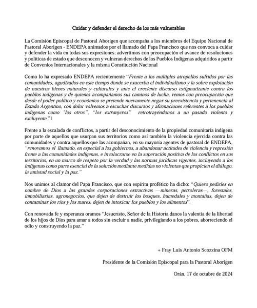 Bajo el título “Cuidar y defender el derecho de los más vulnerables” y con la firma de su presidente, el obispo Luis Scozzina, la Comisión Episcopal de Pastoral Aborigen de la Iglesia Católica contestó.
