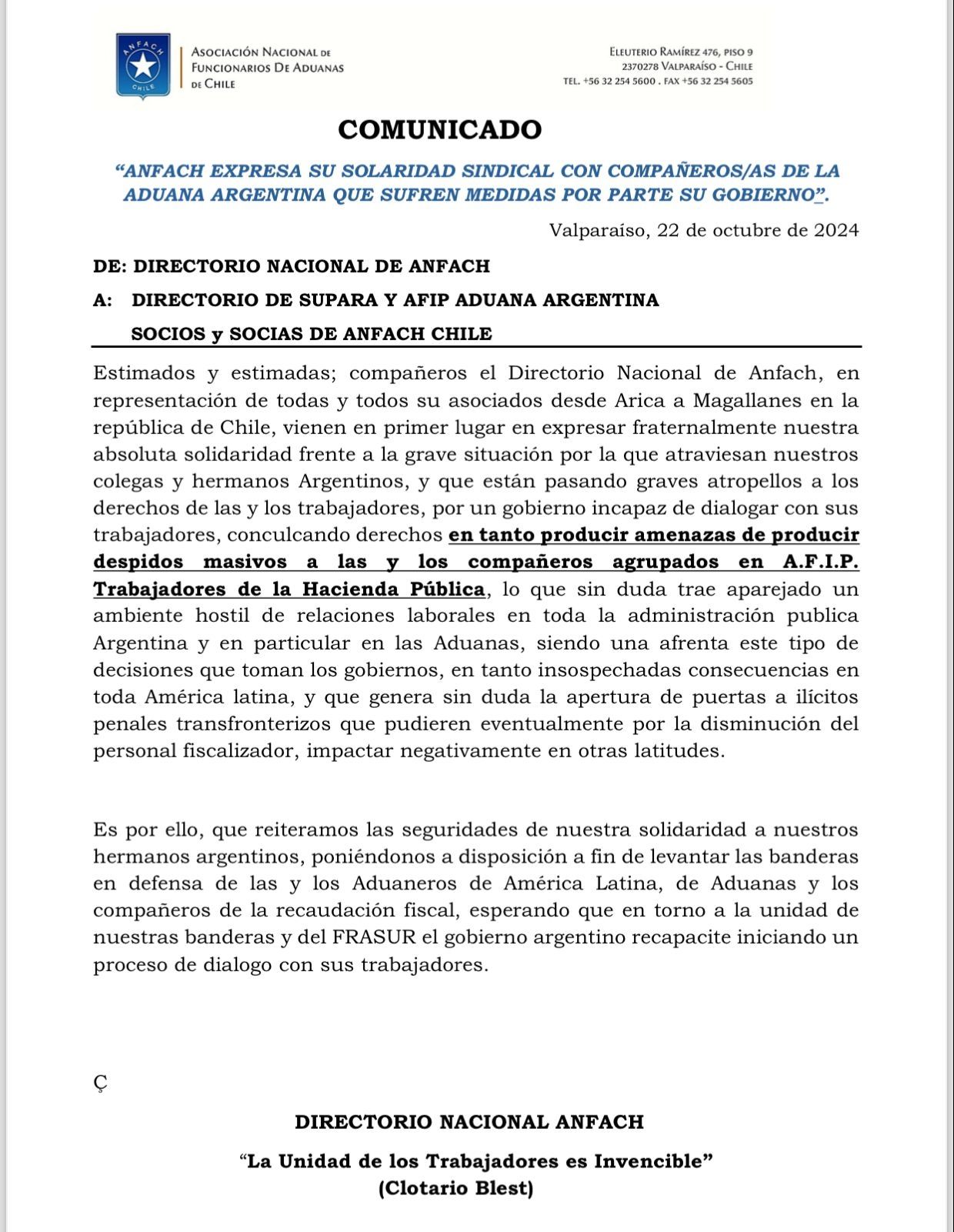 Desde la Asociación nacional de Funcionario de Aduanas de Chile (ANFACH) expresaron su solidaridad sindical con sus compañeros de la aduana argentina tras las medidas que ha dado a conocer el Gobierno de Javier Milei. Sostuvieron que: "Están pasando por graves atropellos los trabajadores por un gobierno incapaz de dialogar con sus trabajadores" y también remarcaron que se producen amenazas por despidos masivos a los trabajadores de AFIP.