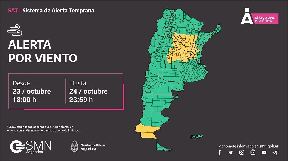 El Servicio Meteorológico Nacional (SMN), a través de su Sistema de Alerta Temprana, emitió una serie de advertencias para este jueves 24 de octubre por tormentas y vientos fuertes en distintas zonas del territorio nacional.