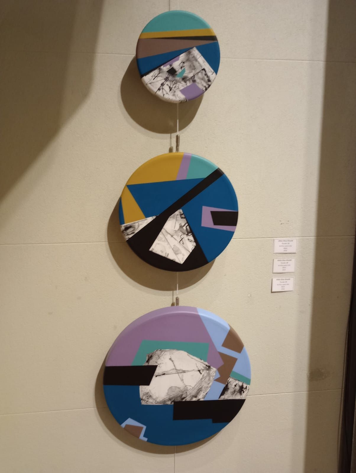 Los largos años dedicados a las artes plásticas le permiten navegar por diferentes expresiones y tener una libertad única en la utilización de técnicas, es así que en esta ocasión podemos ver cómo trabaja en los llamados “Tondos” obras redondas que conforman un todo entre la grafía el plano y trabajar el círculo.