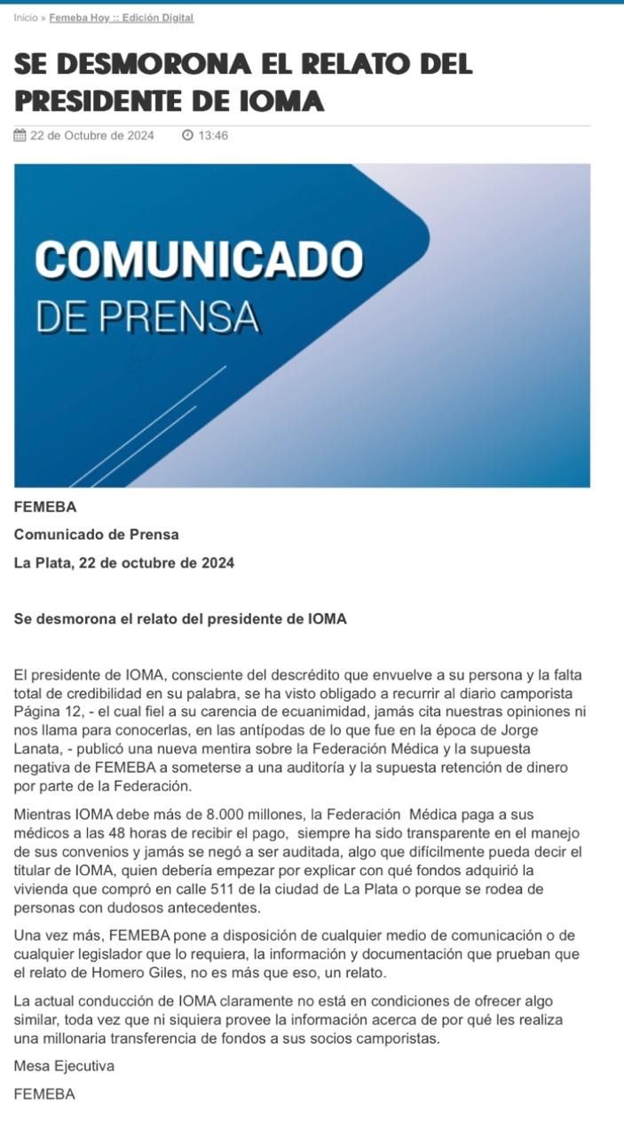 A todo esto, mediante un comunicado, la mesa ejecutiva de FEMEBA remarcó que "mientras IOMA debe más de 8.000 millones, la Federación Médica paga a sus médicos a las 48 horas de recibir el pago, siempre ha sido transparente en el manejo de sus convenios y jamás se negó a ser auditada".