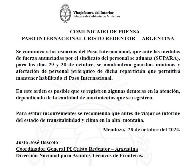 “Se comunica a los usuarios del Paso Internacional que ante las medidas de fuerza anunciadas por el sindicato del personal de Aduana (Supara) para los días 29 y 30 de octubre se mantendrán guardias mínimas y afectación de personal jerárquico de dicha repartición que permitirá mantener habilitado el Paso Internacional.