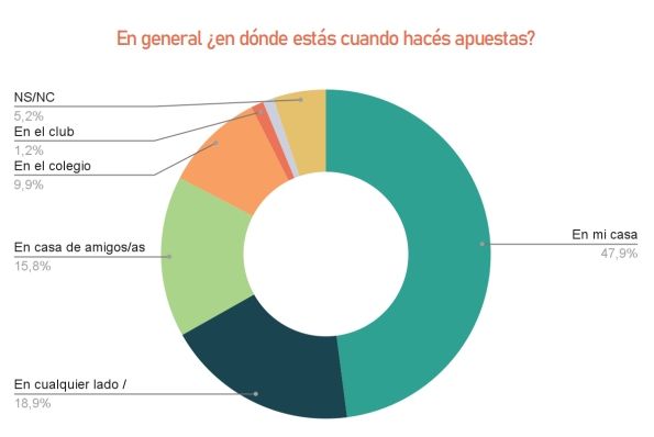 Otro dato significativo tiene que ver con el lugar desde el cual eligen practicar las apuestas. En principio, el 47,9% contó que prefiere apostar desde la comodidad de la casa, seguido por los que eligen practicarlo en "cualquier lugar", con un 18,9% de las respuestas. Por debajo quedan las escuelas, donde menos del 10% de los adolescentes apuesta desde el celular. Eso sí, alrededor del 39% de los estudiantes prefiere apostar en grupo, por lo cual organizan encuentros.