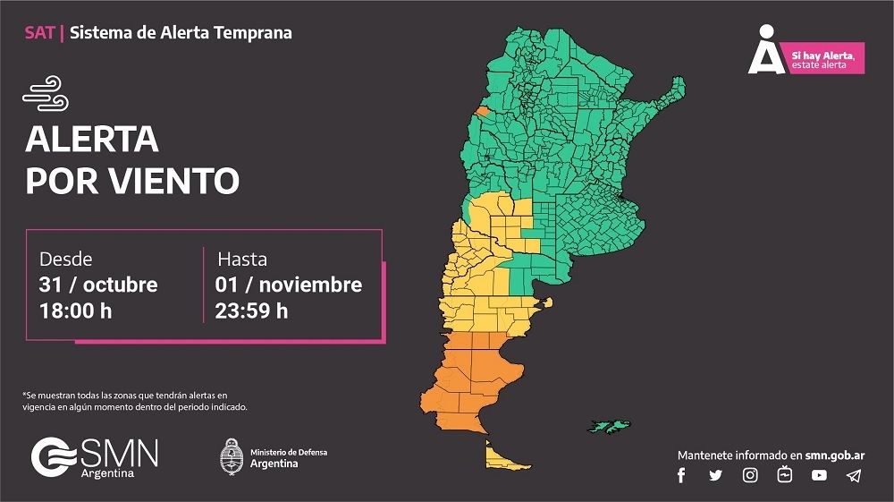 El Servicio Meteorológico Nacional (SMN), a través de su Sistema de Alerta Temprana, emitió una serie de advertencias para este viernes 1 de noviembre por vientos fuertes, tormentas y Zonda en varias provincias.