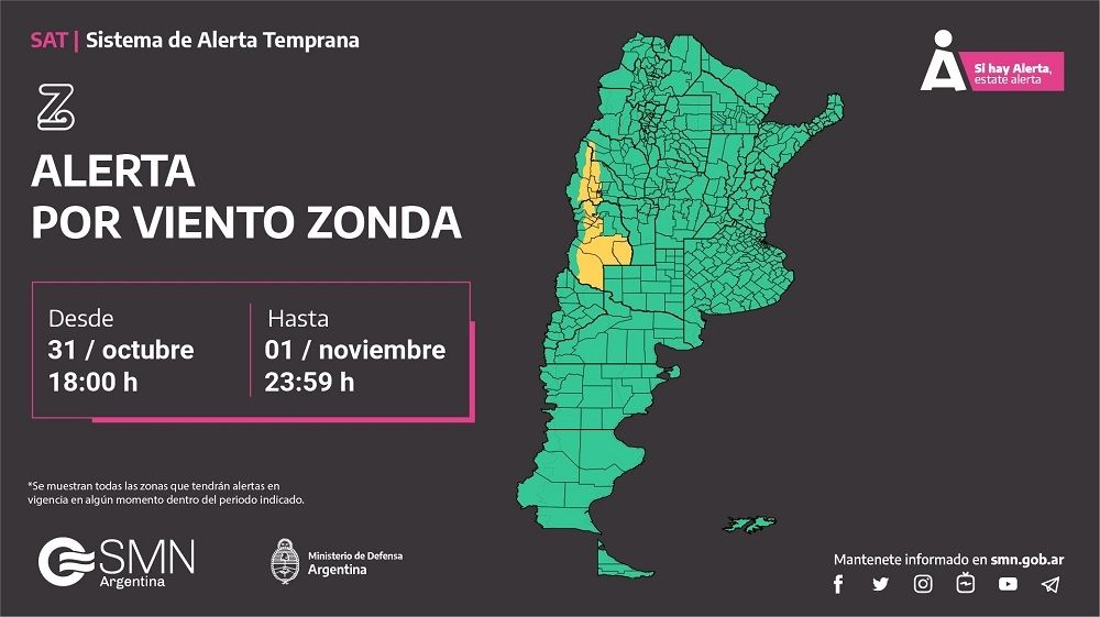 El SMN también indicó que hay alerta amarilla por Zonda en gran parte de Mendoza y San Juan: “El área será afectada por viento Zonda, con velocidades entre 40 y 50 km/h y ráfagas que pueden alcanzar hasta 65 km/h. Este fenómeno podría provocar una reducción de la visibilidad, un aumento repentino de la temperatura y condiciones de humedad relativa muy baja”.
