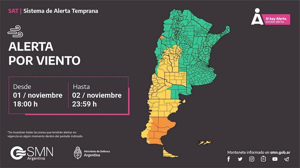 El Servicio Meteorológico Nacional (SMN), a través de su Sistema de Alerta Temprana, emitió una serie de advertencias para este sábado 2 de noviembre por tormentas y vientos fuertes en gran parte del país.