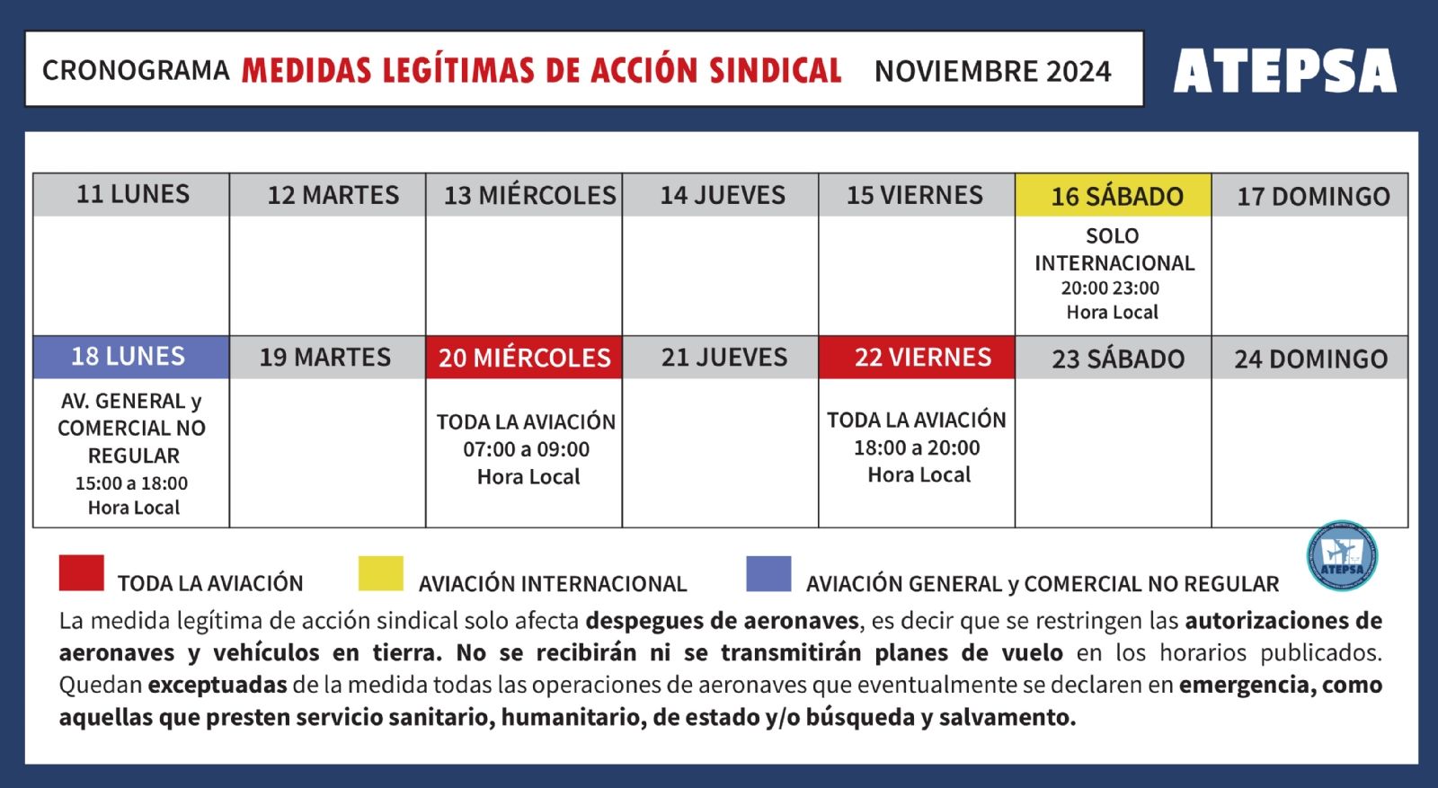 "Informamos que los trabajadores y trabajadoras de EANA S.E. representados por Atepsa, adoptaremos medidas legítimas de acción sindical a partir del 16 de noviembre, y que continuarán a lo largo del mes", indicaron en la misiva emitida desde el sindicato. Además, dieron indicios sobre como continuarán las medidas: "Toda vez que los servicios de navegación aérea constituyen un servicio público esencial, procederemos a ejercer nuestro legítimo derecho constitucional a huelga respetando y garantizando el porcentaje previsto en la reglamentación vigente, tal como fuere acordado en el ámbito de la Secretaria de Trabajo".