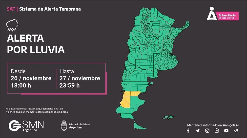 También hay alerta amarilla por lluvias en Chubut y Santa Cruz: “El área será afectada por lluvias persistentes, algunas fuertes. Se esperan valores de precipitación acumulada entre 20 y 35 mm, que pueden ser superados de manera puntual. El fenómeno podría estar acompañado por tormentas eléctricas”.