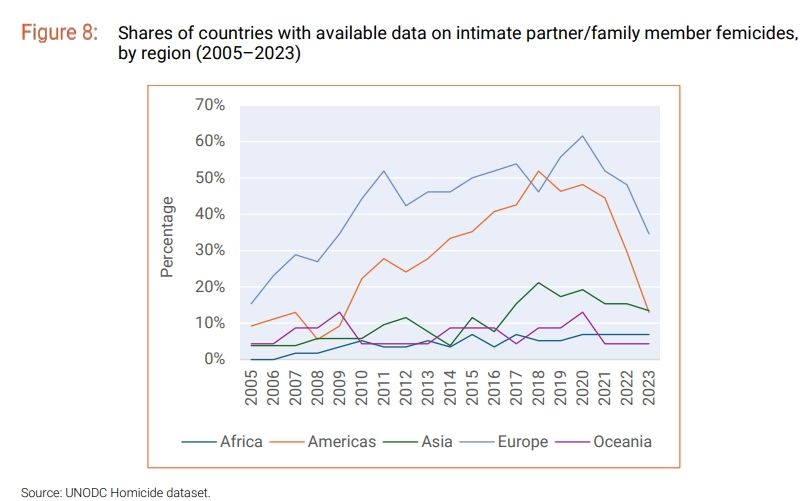 "En las dos últimas décadas, el número de países que han presentado datos sobre el asesinato de mujeres por parte de parejas íntimas u otros miembros de la familia ha aumentado lentamente, alcanzando su punto máximo en 2020 (75 países). Sin embargo, el número disminuyó después de eso y para 2023 fue la mitad del número de 2020", advierten los especialistas, en comparativa con los femicidios registrados en los años anteriores.
