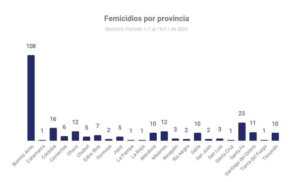 La mayor cantidad de femicidios se llevó a cabo en Buenos Aires, con una cifra de 108 hasta el momento. En segundo lugar, con un gran porcentaje de diferencia, se ubica la provincia de Santa Fe con un total de 23 femicidios en lo que va del año. Luego, Córdoba registró 16, mientras que Misiones y Chaco presentaron un total de 12 muertes de mujeres por violencia de género.