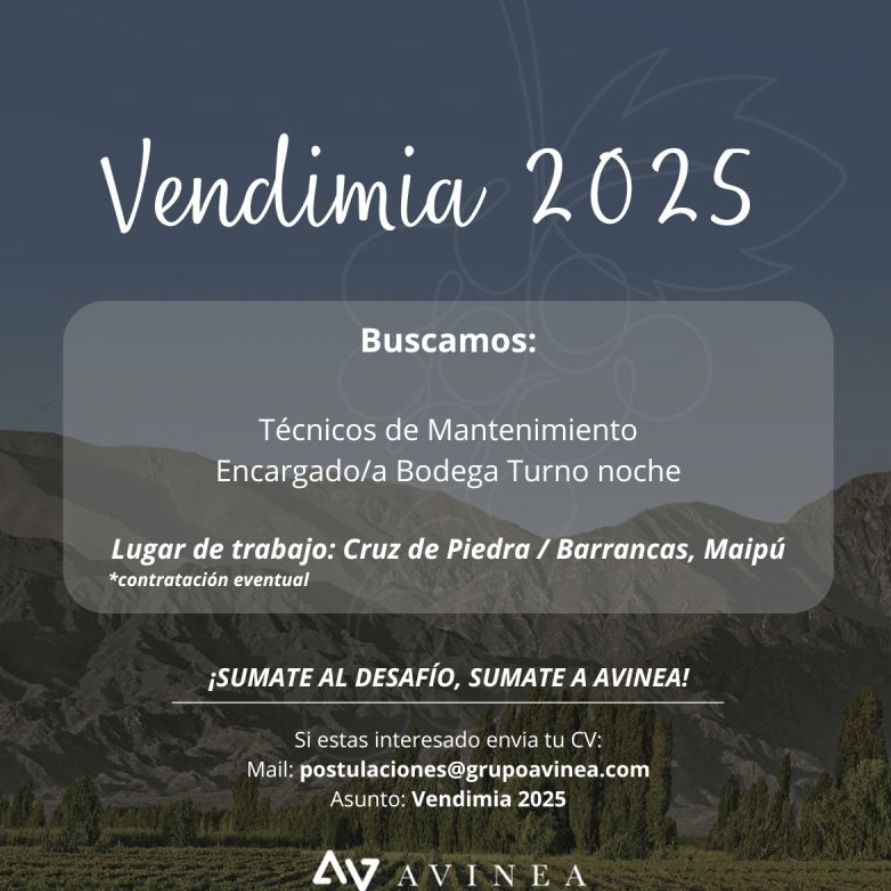 Los interesados en el puesto de Técnico en Mantenimiento o Encargado de Bodega turno noche, deben enviar su CV al mail [email protected] con el asunto "Vendimia 2025". Una gran oportunidad de trabajo para la temporada.