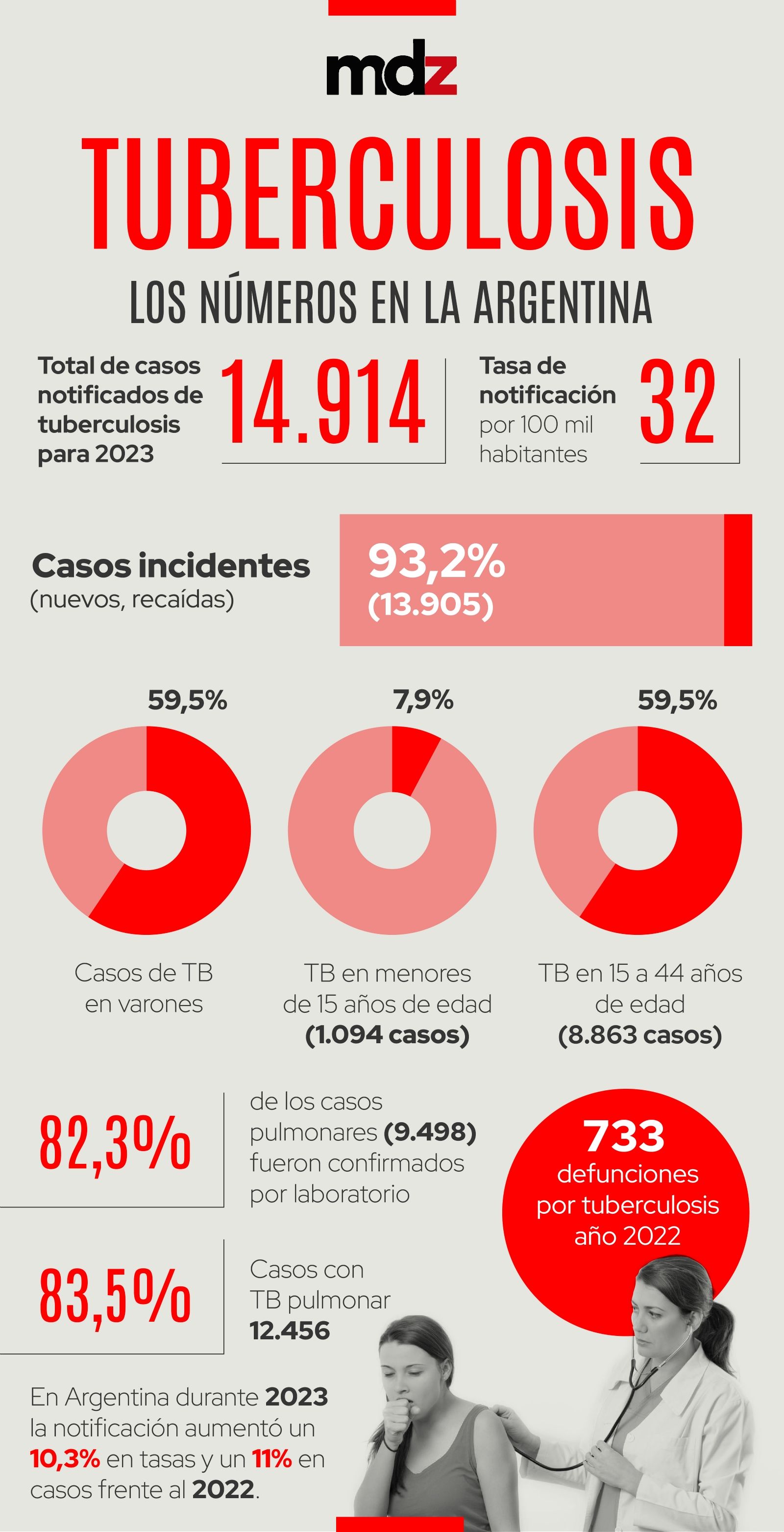 Según el último informe del Ministerio de Salud de la Nación (2023), en la Argentina existen 14.914 infectados por esta enfermedad que, a pesar de su temible nombre, es tratable y curable si se la aborda a tiempo. Según este informe, 32 de cada 100 mil habitantes del país sufren de tuberculosis, habiéndose registrado un aumento del 11% de informes entre 2022 y 2023.