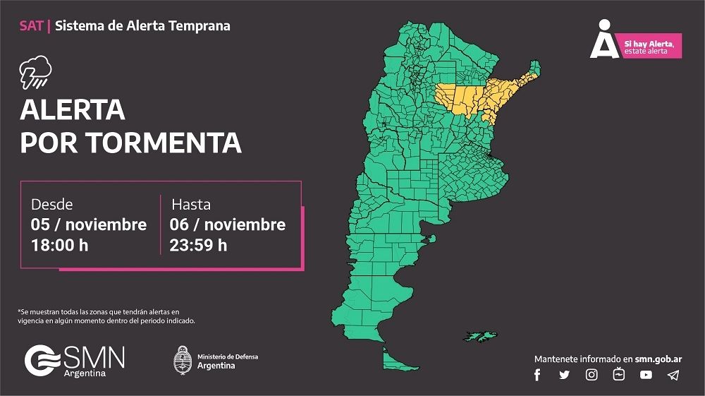 El Servicio Meteorológico Nacional (SMN), a través de su Sistema de Alerta Temprana, emitió una serie de advertencias para este miércoles 6 de noviembre por vientos, lluvia y tormentas en varias provincias.