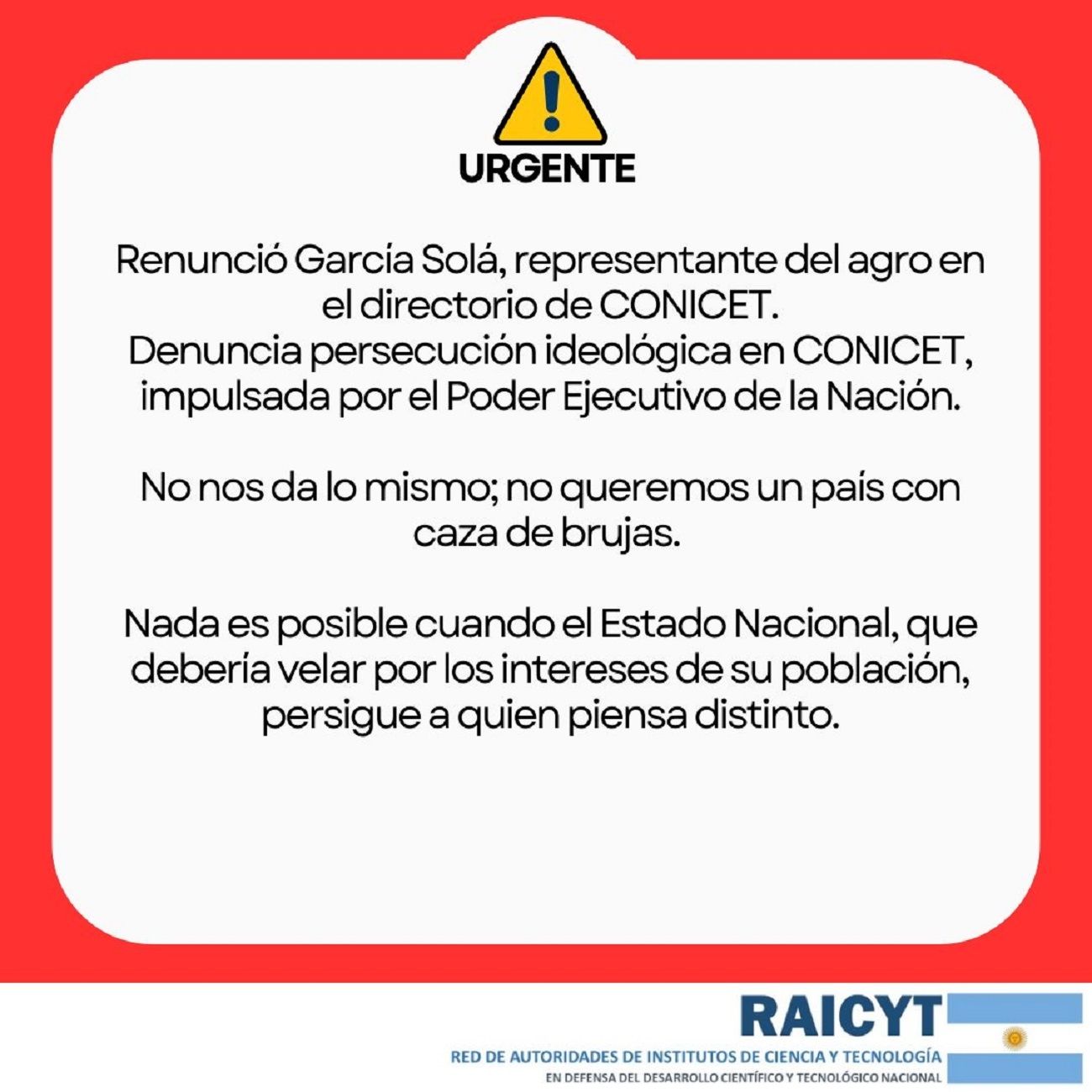 Ante lo ocurrido, la Red de Autoridades de Institutos de Ciencia y Tecnología (Raicyt) emitió un comunicado donde alertan que "García Solá, representante del Agro, se va, denunciando persecución ideológica en el Conicet, impulsada por el Poder Ejecutivo de la Nación. No nos da lo mismo, no queremos un país con caza de brujas, nada es posible cuando el Estado Nacional, que debería velar por los intereses de su población, se persigue a quien piensa distinto", subrayó.