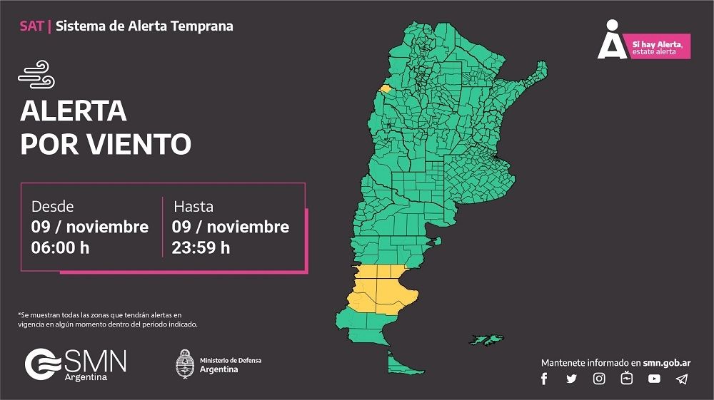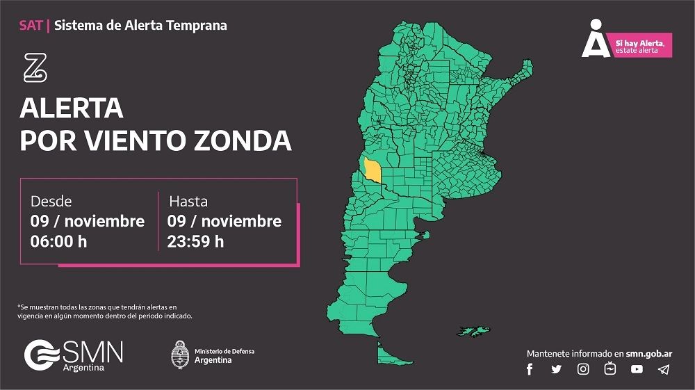 El Servicio Meteorológico Nacional (SMN), a través de su Sistema de Alerta Temprana, emitió una serie de advertencias para este sábado 9 de noviembre por tormentas, viento, lluvia e incluso Zonda.