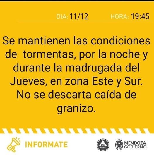 Según el Sistema de Alerta Temprana del SMN, hay alerta amarilla por tormentas en la zona Este provincial, además de San Rafael y Alvear.