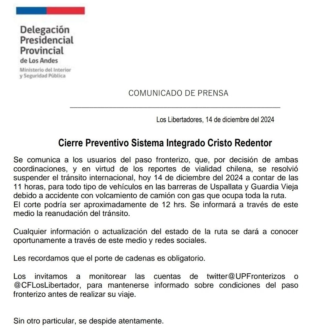 Si lo que anticipan las autoridades chilenas se cumple, por segundo sábado consecutivo, el tránsito por la ruta internacional estaría cerrado para todo tipo de vehículos por un accidente con un camión que bloquea el paso. En esta ocasión, afortunadamente, no hubo fallecidos.