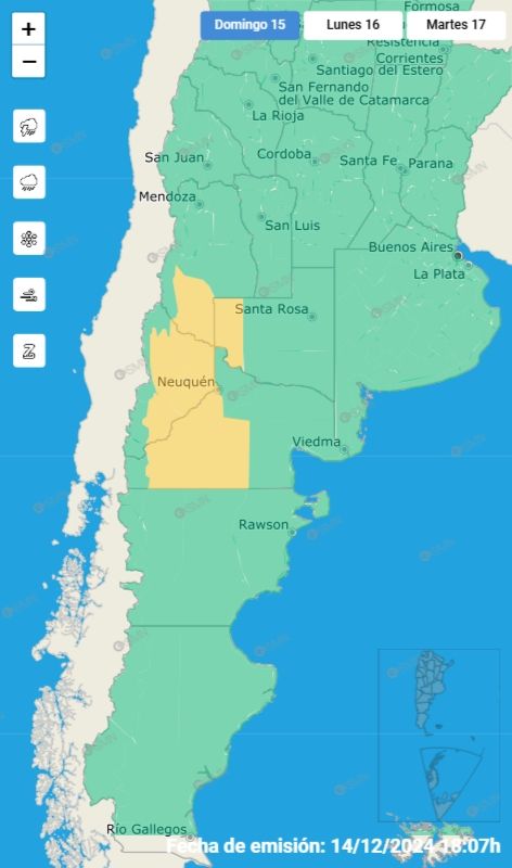 Desde la tarde se esperan tormentas en todo el territorio mendocino, aunque en el sur de la provincias estas serán más intentas, por lo que el Servicio Meteorológico Nacional emitió una alerta amarilla: "El área será afectada por tormentas aisladas, algunas localmente fuertes. Las mismas podrán estar acompañadas por abundante caída de agua en cortos periodos, actividad eléctrica fuerte, ráfagas intensas y caída de granizo ocasional. Se esperan valores de precipitación acumulada entre 20 y 40 mm, pudiendo ser superados de forma puntual".