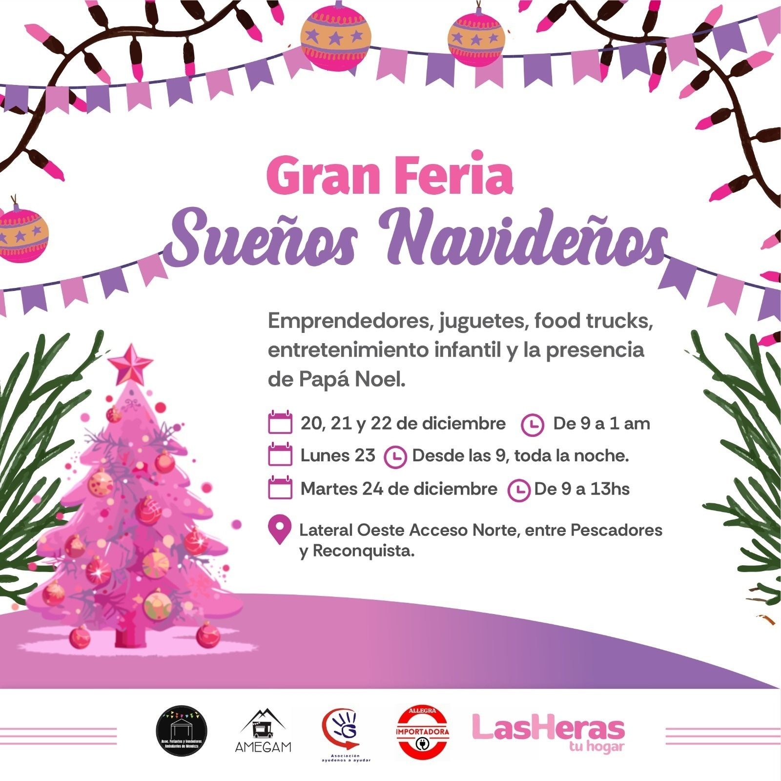 La feria de Navidad de Las Heras también promete ser una de las más grandes de Mendoza con 200 puestos. La Gran Feria Sueños Navideños funcionará hasta el 24 de diciembre en Lateral Oeste Acceso Norte (Pescadores y Reconquista). Todos los días abrirá a las 9, el lunes atenderá toda la noche y el 24 el horario será de 9 a 13.
