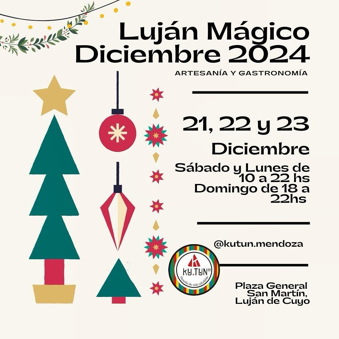 Los días 21, 22 y 23 de diciembre Luján de Cuyo tendrá su feria de Navidad en la plaza San Martín (San Martín y Balcarce). El sábado y domingo funcionará de 10 a 22 y el domingo de 18 a 22. Además de artesanías habrá opciones gastronómicas.