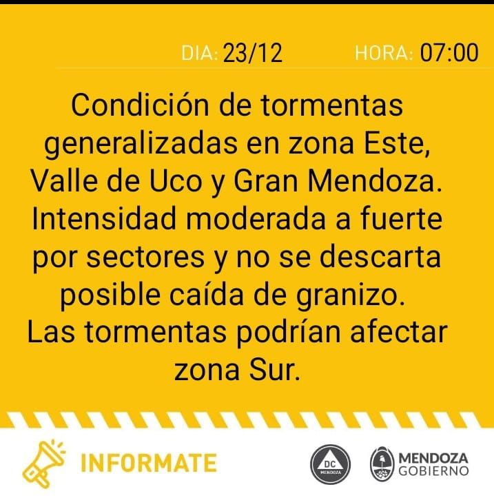 El Servicio Meteorológico Nacional (SMN) detalló que la alerta afecta al este de Las Heras, Santa Rosa, La Paz, Lavalle y San Martín. "El área será impactada por tormentas localmente fuertes, acompañadas de abundante caída de agua en cortos períodos, ráfagas de hasta 60 km/h, ocasional caída de granizo y elevada actividad eléctrica. Se esperan acumulaciones de lluvia entre 20 y 45 mm, con valores puntualmente superiores", informó el organismo.