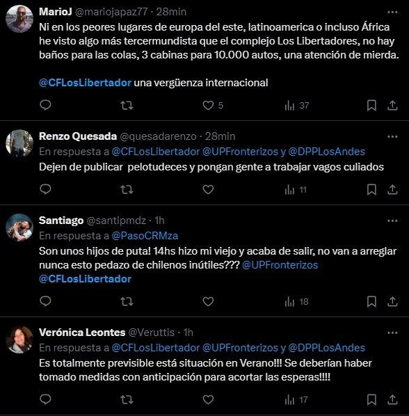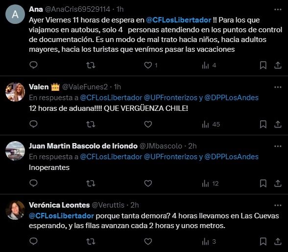 La situación en el paso a Chile es caótica y ya son más de catorce horas de espera para cruzar al vecino país. Hay vehículos que llegaron ayer por la tarde y todavía no pueden llegar al complejo fronterizo de Los Libertadores. La molestia se hace manifiesta a través de redes sociales, principalmente con mensajes hacia la cuenta oficial del recinto limítrofe chileno.