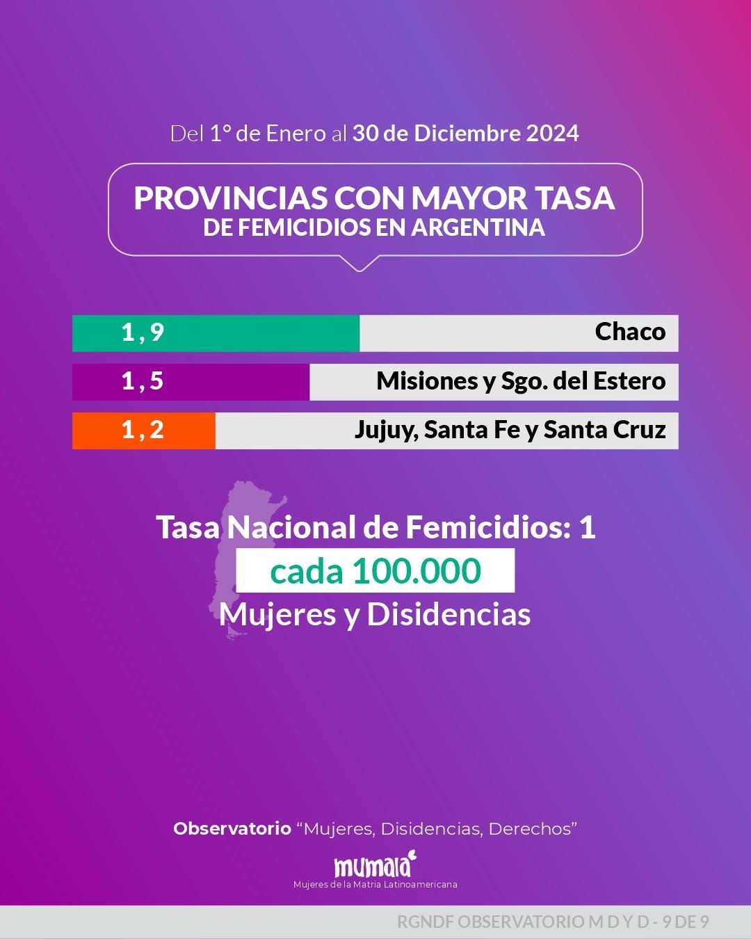 El informe detalla que las provincias con mayores tasas de femicidios son Chaco, Misiones y Santiago del Estero. En la primera, se registró una tasa de 1,9 femicidios cada 100.000 mujeres. En el caso de Misiones y Santiago del Estero, la cifra es de 1,5 femicidios cada 100.000. Luego, siguen Jujuy, Santa Fe y Santa Cruz con una tasa de 1,2 femicidios cada 100.000 mujeres.