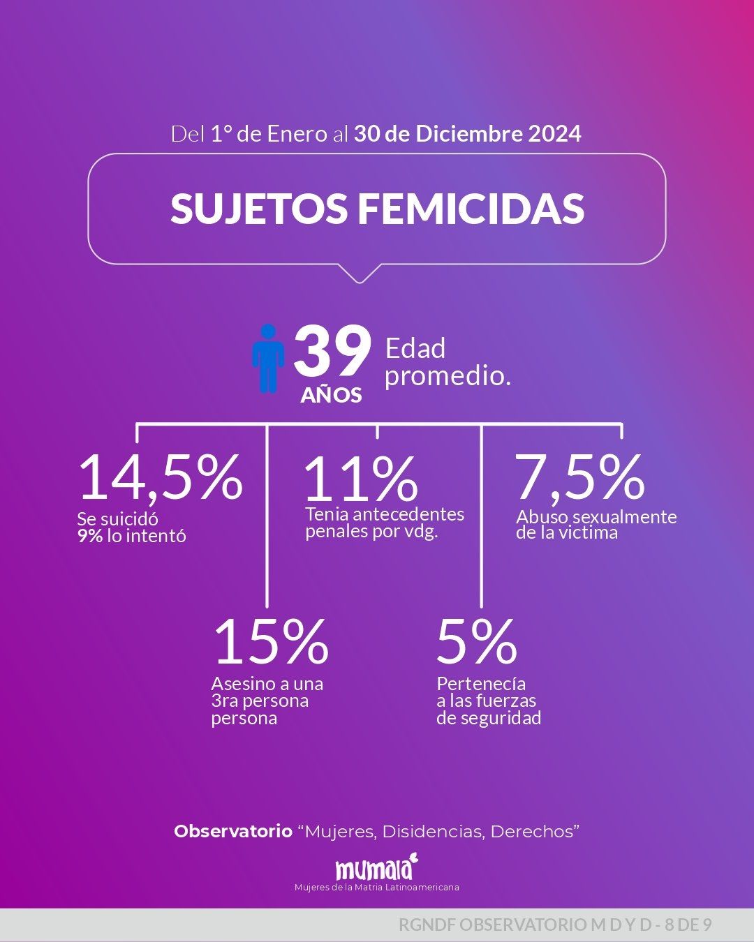 Respecto al perfil de los sujetos femicidas, en promedio tenían 39 años de edad. Del total de los agresores, un 15% asesinó, además, a una tercera persona. También se develó que el 14,5% se suicidó, mientras que el 9% lo intentó. El 11% tenía antecedentes penales por violencia de género y los 7,5% abusó sexualmente de la víctima. Como si fuera poco, el 5% pertenecía a las fuerzas de seguridad.