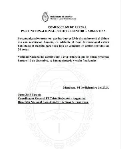 Desde la Coordinación Argentina del Sistema Integrado Cristo Redentor informaron a todos aquellos que quieran usar el paso fronterizo para cruzar a Chile que hoy, jueves 5 de noviembre, será el último día con restricción horaria.