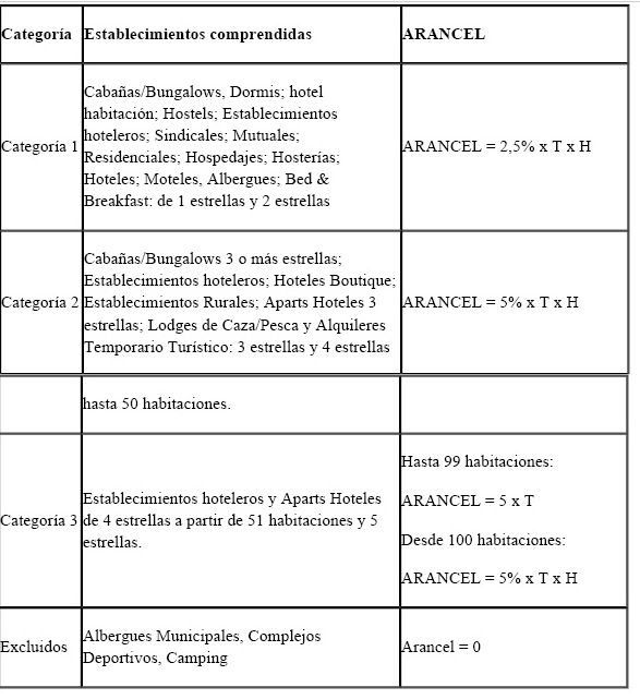 - Categoría 1: Cabañas/Bungalows, Dormitorios; Hotel, habitación; hostels; establecimiento hoteleros; sindicales; mutuales; residenciales; hospedajes; hosterías; hoteles; moteles, albergues; Bed & Breakfast: de 1 y 2 estrellas. En todos estos casos, el arancel se calcula multiplicando el 2,5% por la tarifa de habitación simple.