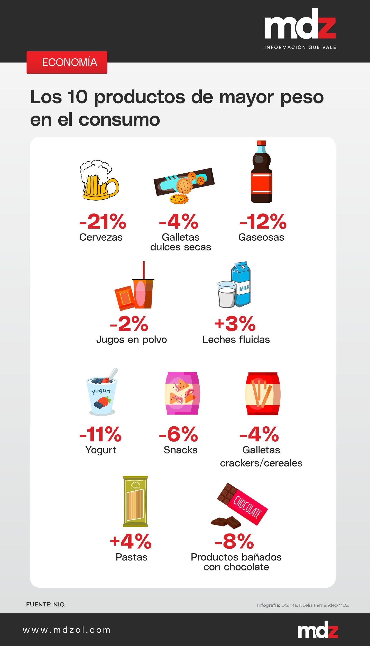 Entre las diez categorías de productos que lideran en términos de volumen de ventas, solo dos muestran un crecimiento positivo: pastas y leches fluidas. Mientras que Pastas exhibe un aumento del 4%, Leches Fluidas presenta un crecimiento del 3%. Las demás categorías, incluyendo yoghurt, gaseosas, cervezas, galletas dulces secas, snacks, galletas crackers/cereales, y productos bañados con chocolate, mostraron caídas en unidades.