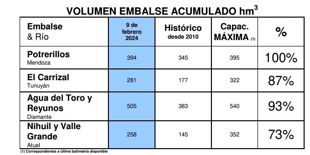 La intención del Departamento General de Irrigación es llegar con el embalse lleno a lo más cerca de la primavera posible, para tener recursos en el momento de mayor demanda para el riego. El río trae más de un 30% por encima de lo pronosticado para la fecha y el doble de caudal normal; pero creen que cuando bajen las temperaturas habrá una compensación y que al final de la temporada, en octubre, el volumen total de agua será cerca de un 20% por encima de lo pronosticado. Nuevamente, es por la cantidad de nieve y por las altísimas temperaturas que generaron más deshielo y más rápido de lo esperado. Aunque las posibilidades de manejo del agua superficial están limitadas, hay otro beneficio bajo la tierra por la recuperación de los acuíferos.