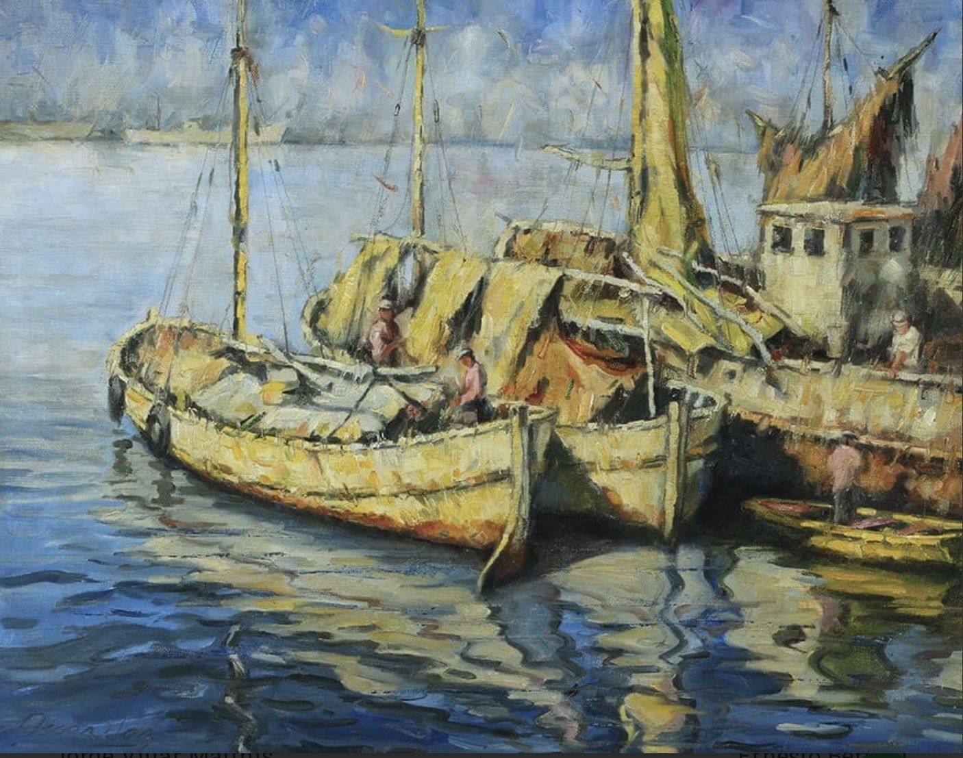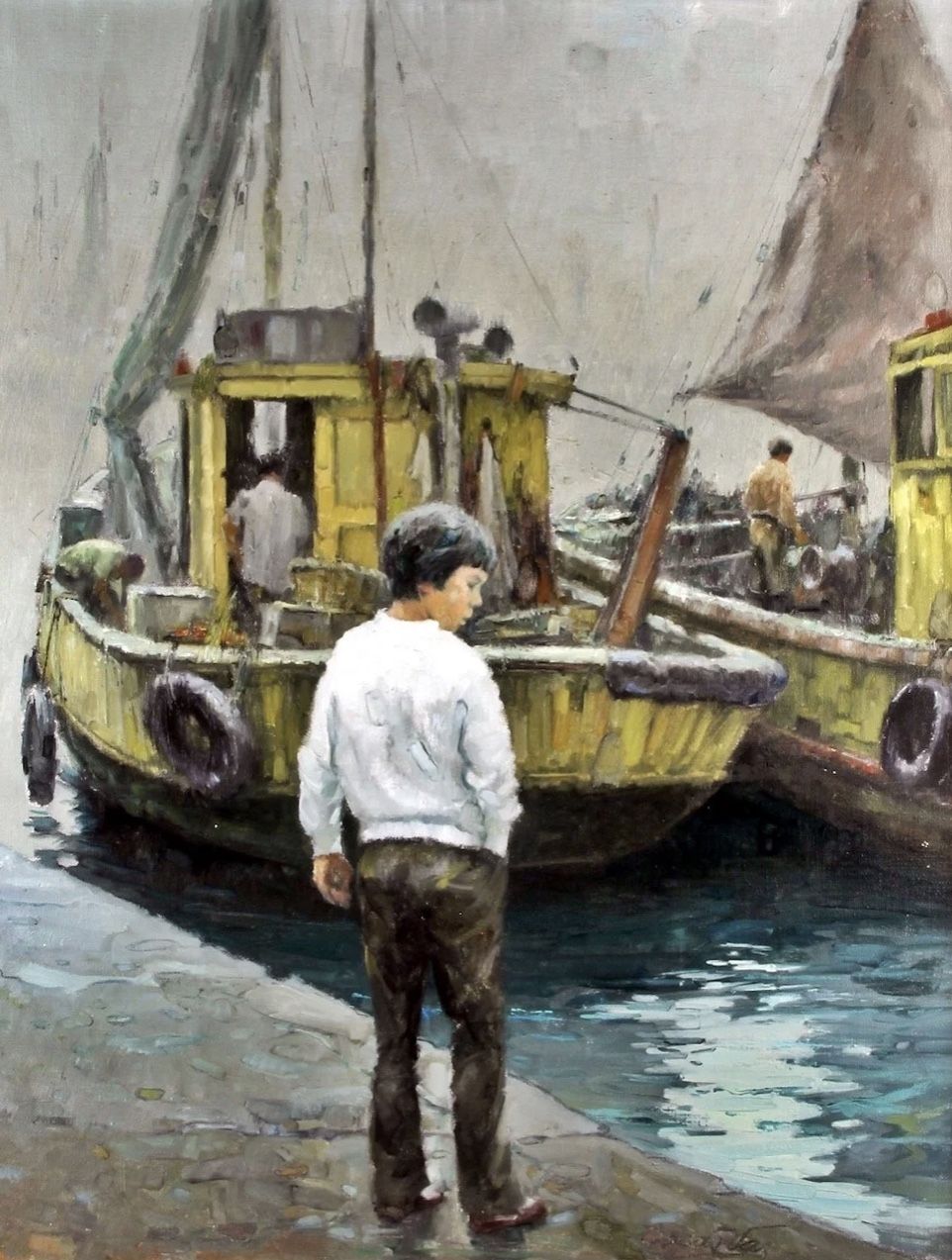 En sus banquinas de pescadores el color da brillo a la escena a que suele incluir la presencia de un par de niños, sus nietos. Cuando su paleta se vuelve nostálgica, en sus famosos grises, no es para narrar la dureza de la vida del hombre de mar, sino para dar cuenta de in clima interior.