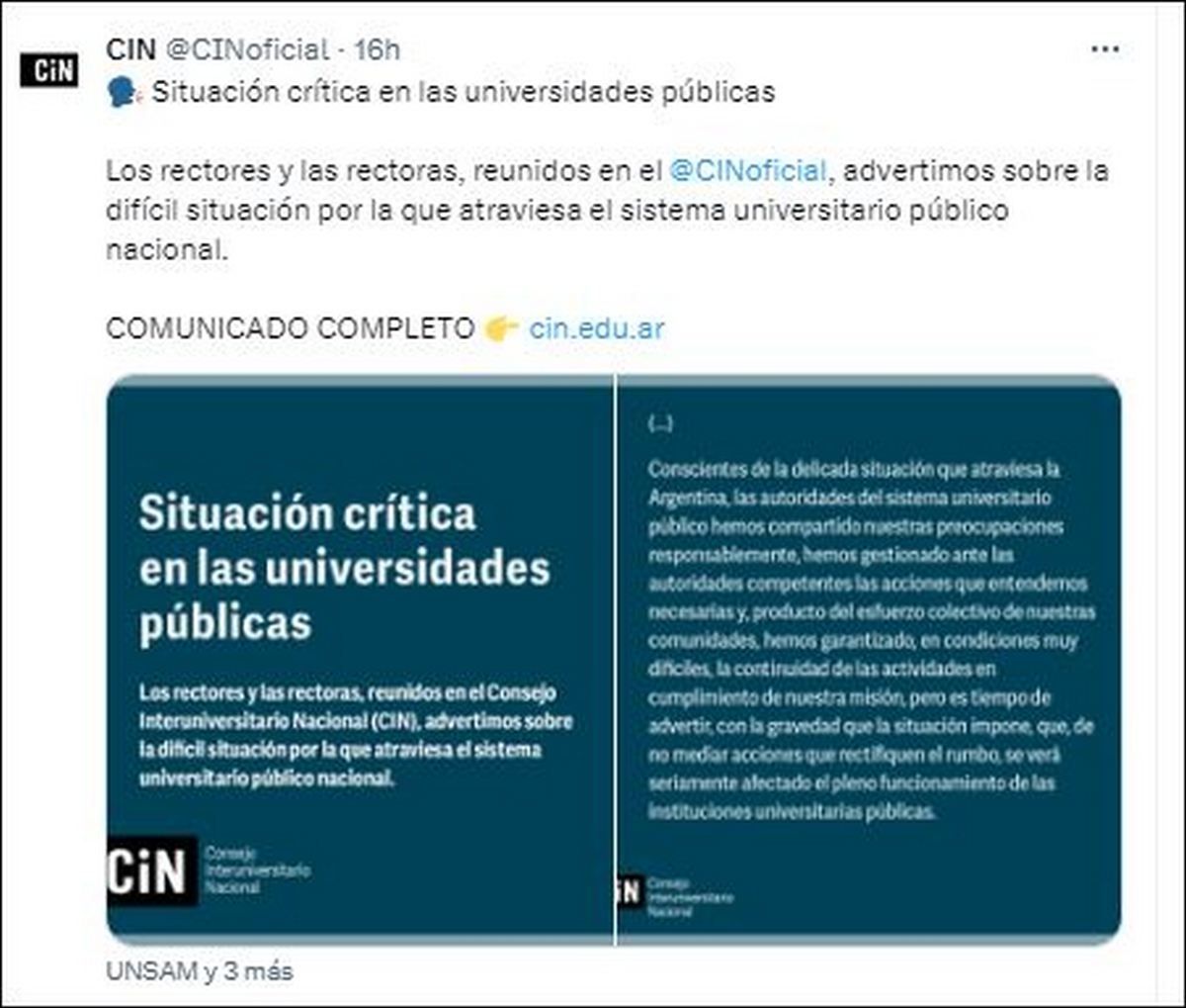 Los rectores que componen el Consejo Interuniversitario Nacional (CIN) emitieron un pronunciamiento en el que advirtieron al Gobierno nacional sobre la crítica difícil situación que atraviesa el sistema educativo universitario, al tiempo que llamaron a los funcionarios a "rectificar el rumbo" y dotar de mayor presupuesto a las universidades públicas.