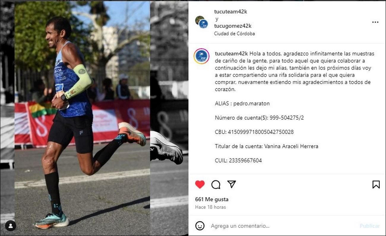 Para poder cumplir su sueño de competir en la próxima maratón que le permita clasificar en los JJOO 2024, lanzó a su regreso de Sevilla un sorteo y difundió sus datos bancarios a través de sus redes sociales. Estos son los datos para poder colaborar con el atleta que quiere representar a nuestro país en París 2024.
