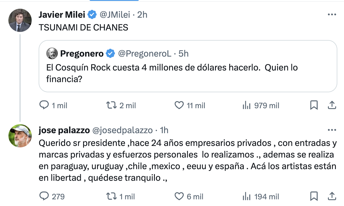 Todo comenzó cuando Javier Milei retuiteó a un usuario de X en plena pelea con los gobernadores por el frustrado tratamiento de la ley ómnibus en la Cámara de Diputados. Desde su cuenta, @PregoneroL escribió: "El Cosquín Rock cuesta 4 millones de dólares hacerlo. Quien lo financia?", a lo que el Presidente acompañó con la frase: "TSUNAMI DE CHANES".