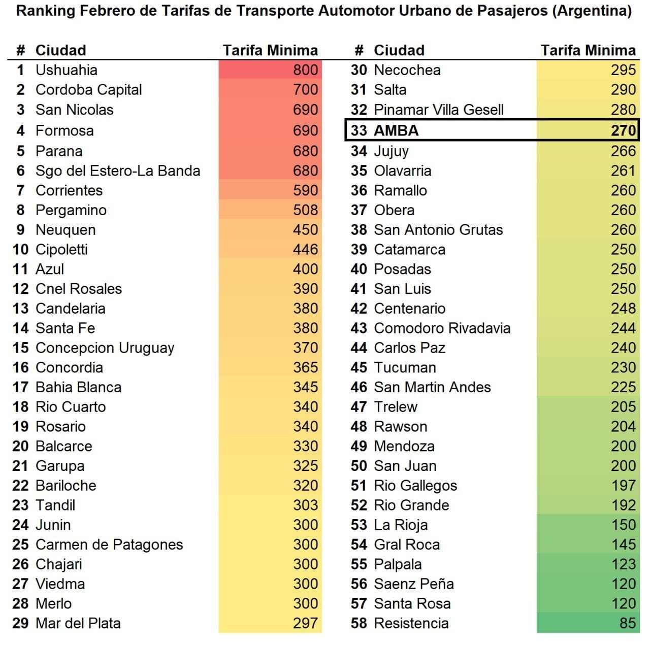 Los valores del boleto en todo el país