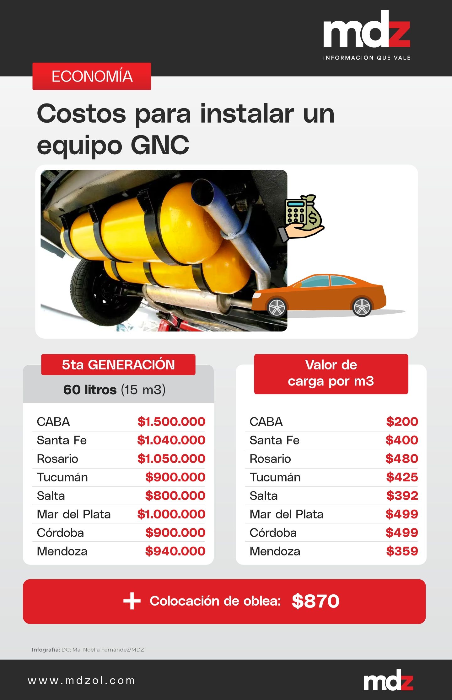 Los costos cambian en distintas partes del país, con algunos mucho más caros que en otras ciudades. Según un relevamiento hecho por MDZ, la Ciudad de Buenos Aires es la mas cara para realizar la instalación del equipo de GNC de quinta generación de 15 metros cúbicos, con un valor de $1.500.000. Al otro extremo, en Salta se conseguirían hacer el mismo trabajo por $800.000.