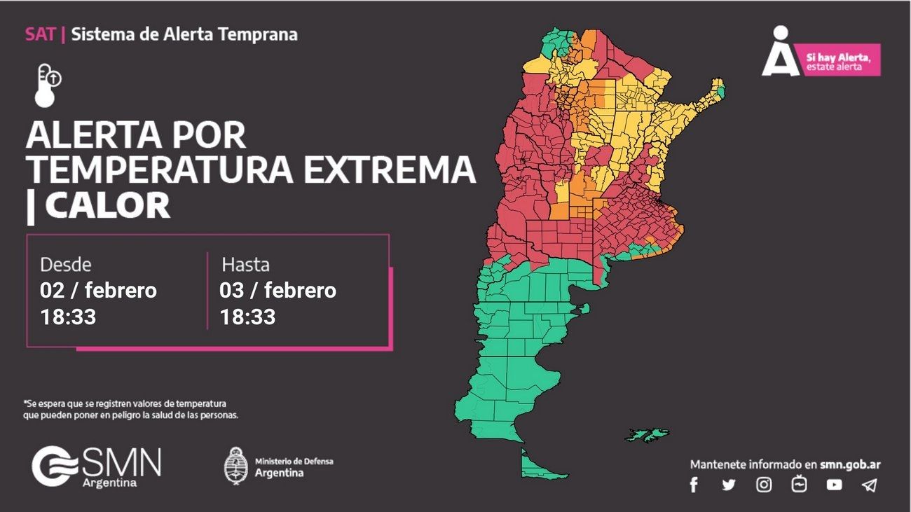 El calor extremo alcanzará a más de la mitad del país -al menos quince provincias señala el organismo nacional-, y el alerta roja indica que en esas zonas las temperaturas se tornan "muy peligrosas y pueden afectar a todas las personas, incluso a las saludables", por lo que se recomienda aumentar el consumo de agua y no exponerse al sol en exceso ni en horas centrales (entre las 10 y las 16).